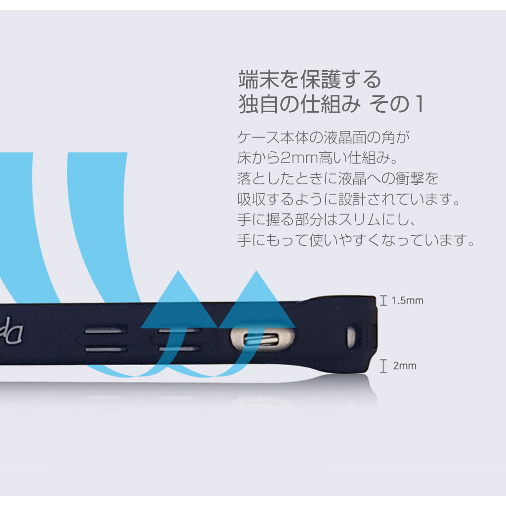 ケースの4つ角がデコになっているので、端末をよりしっかりと保護します。