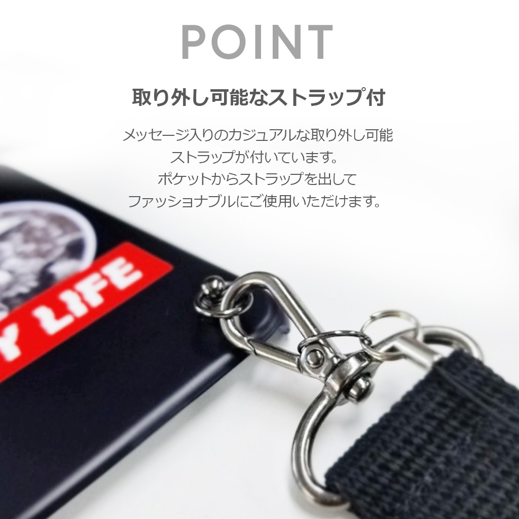 メッセージ入りのカジュアルな取り外し可能なストラップが付いています。ポケットからストラップを出してファッショナブルにご使用いただけます。