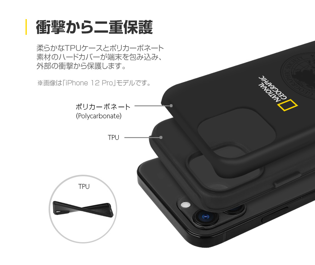 柔らかなTPUケースが端末を包み込み、ポリカーボネート素材のハードカバーが外部の衝撃から保護します。