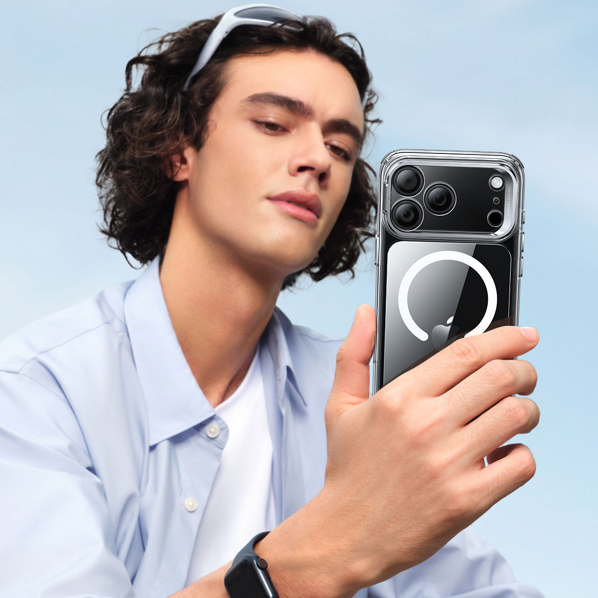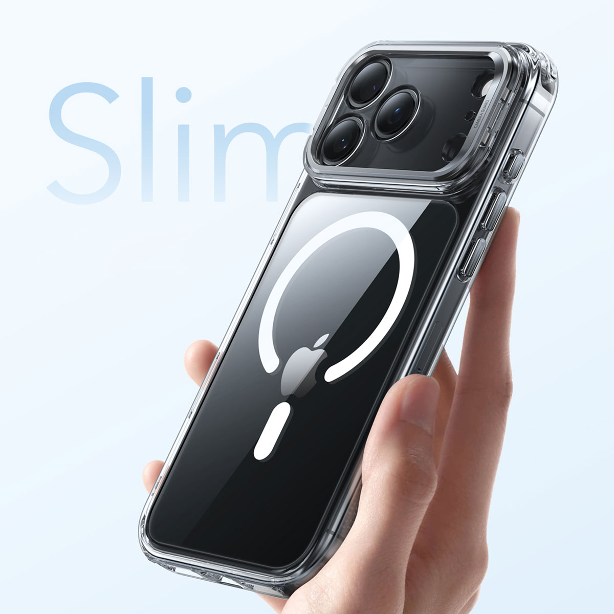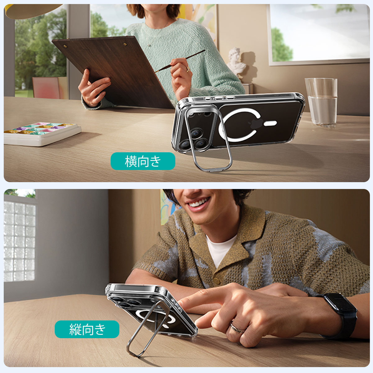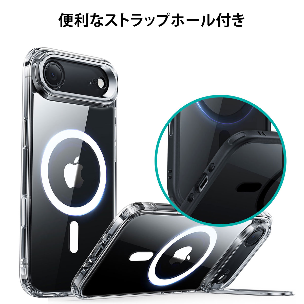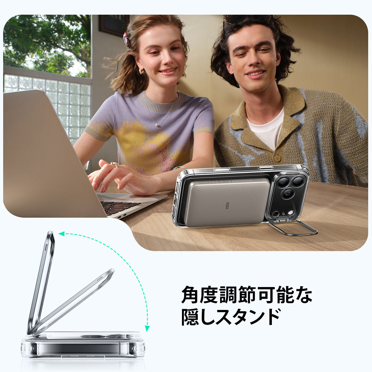 ESR「Classic スタンド付きハイブリッドケース 」は、カメラフレームが隠しスタンドとして展開するハイブリッドクリアケースです。MagSafe対応アクセサリがスムーズに吸着する、強力なマグネットを搭載しています。