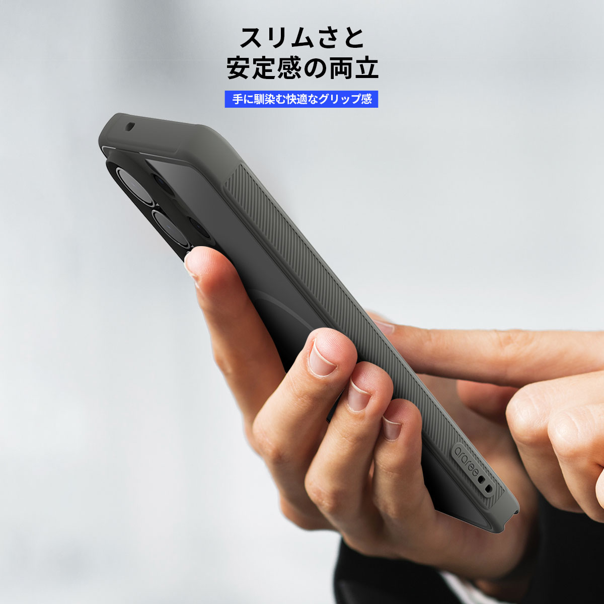 ケースのベゼルに施された凹凸パターンが滑り止め効果を発揮し、スマートフォンの持ちやすさを向上。落下の心配を軽減します。