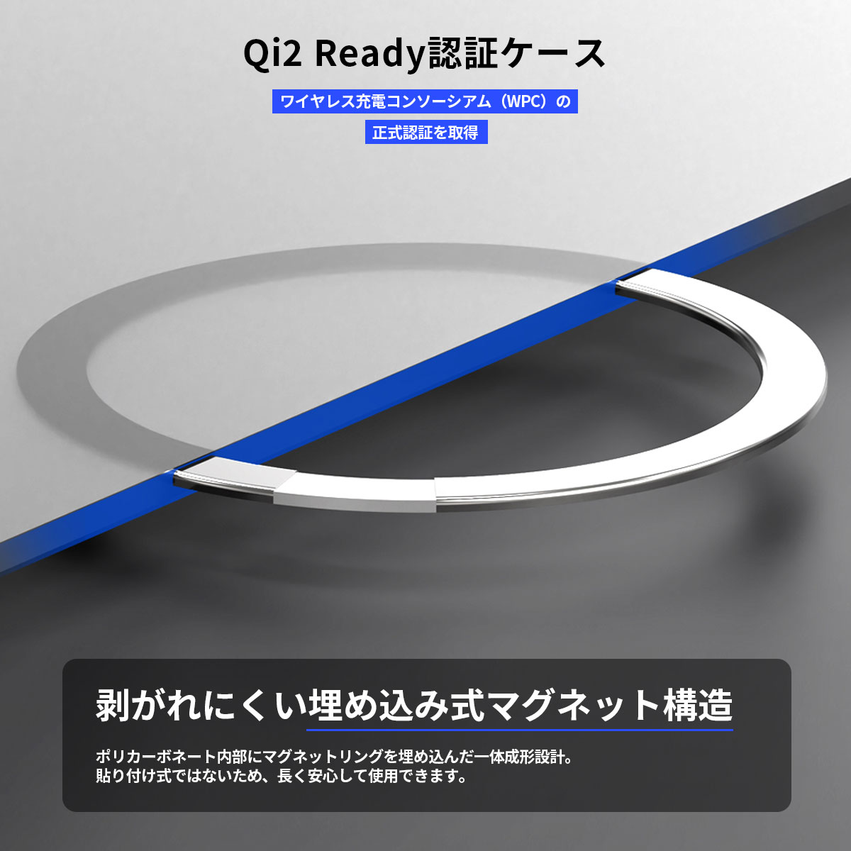 ワイヤレス充電コンソーシアム(WPC)の正式認証を取得した、正規のQi2 Readyケースです。 マグネットリングを搭載し、充電器側とスマートフォン側の送信・受信コイル位置が正確に合うことで、安定した急速ワイヤレス充電を実現します。