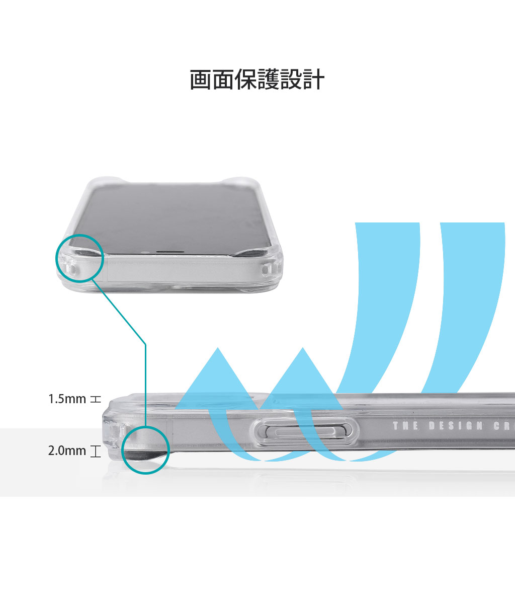 ケースの四隅にエアクッションがあり衝撃を吸収、落下から端末を保護します。