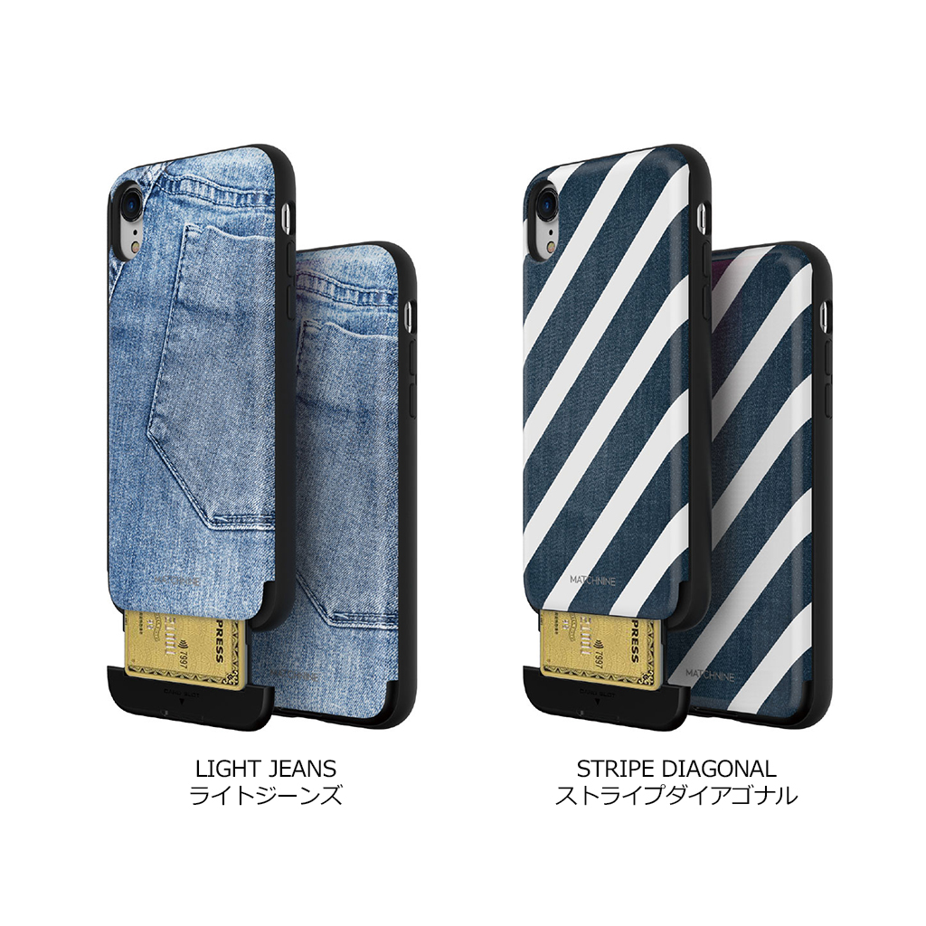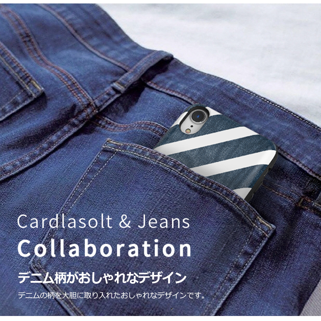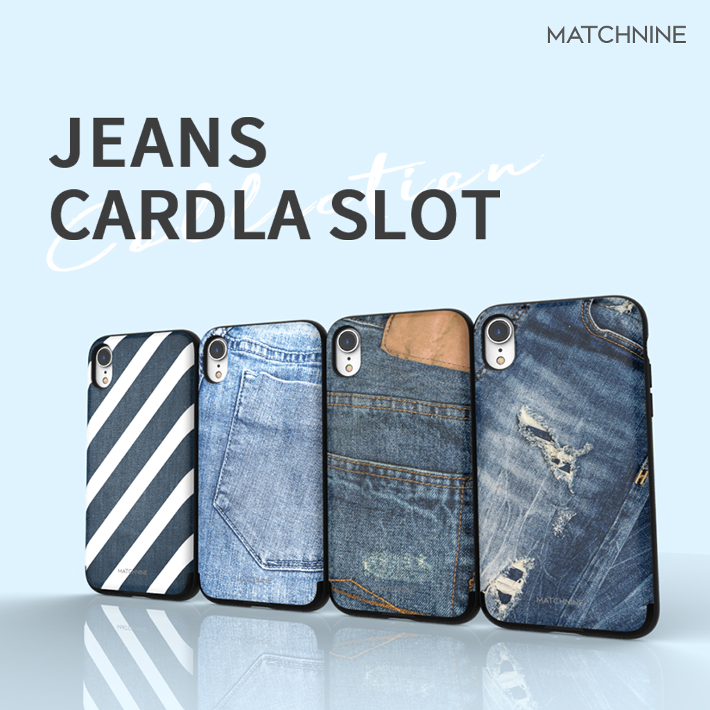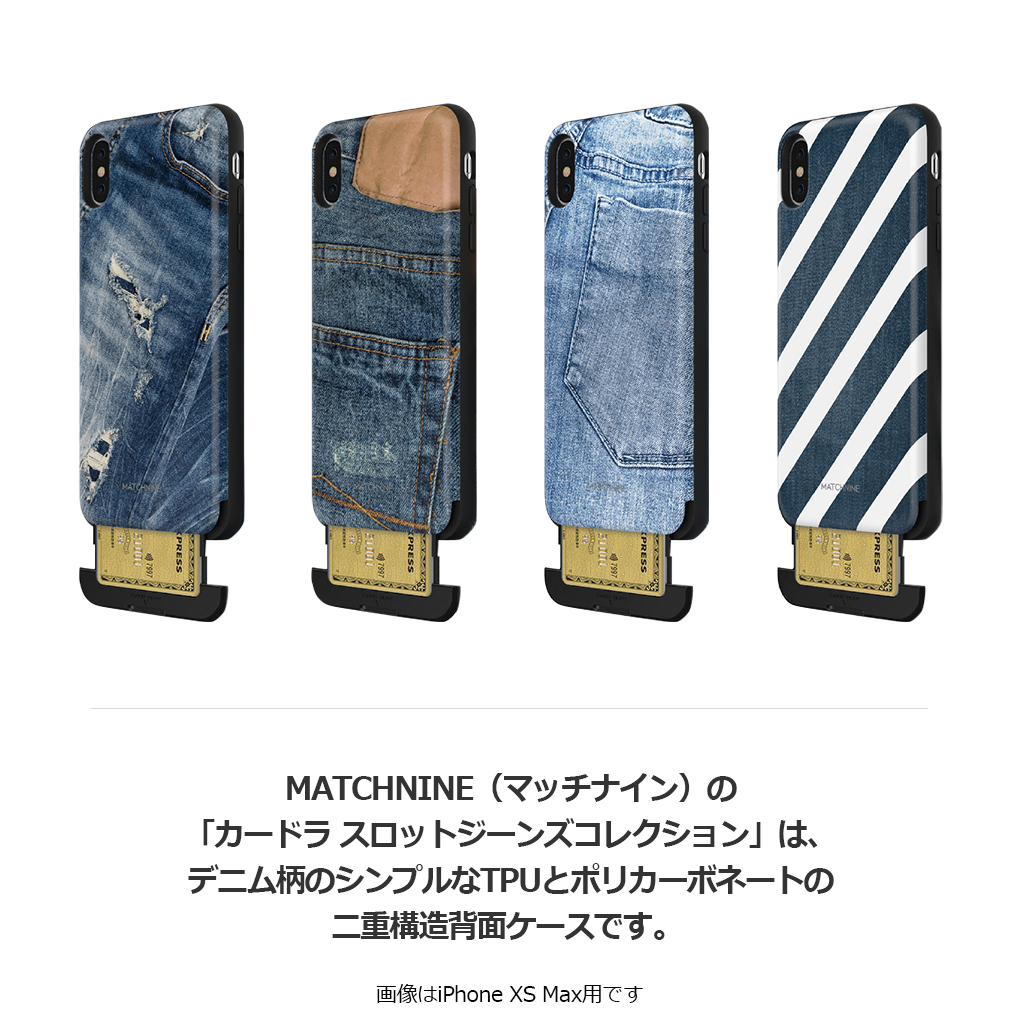 MATCHNINE(マッチナイン)の「カードラ スロットジーンズコレクション」は、デニム柄のシンプルなTPUとポリカーボネートの二重構造背面ケースです。