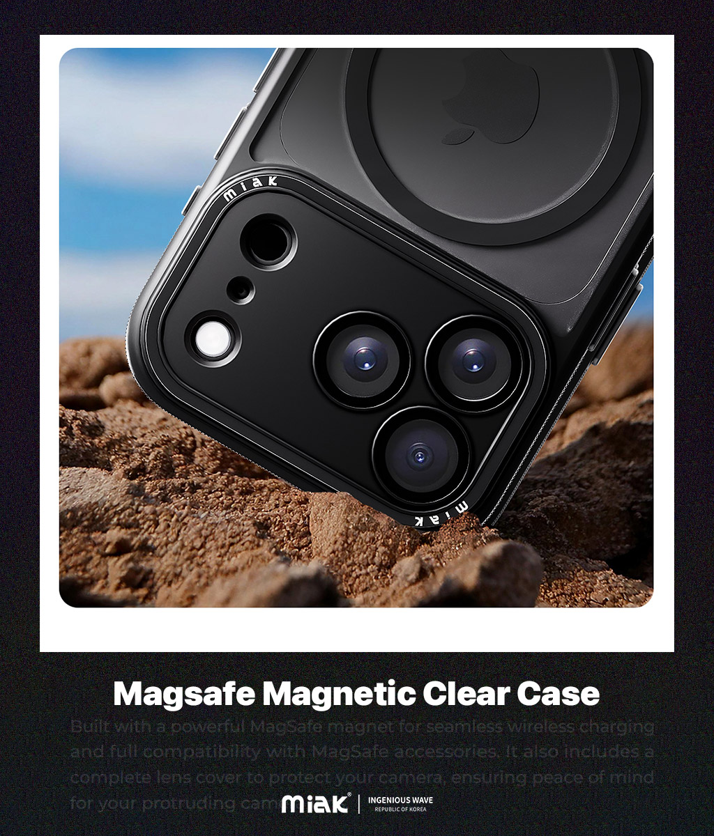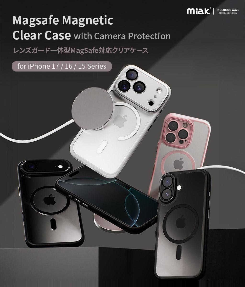 miakの「レンズガード一体型MagSafe対応クリアケース」は,カメラレンズガードが付いた、MagSafe対応のクリアケースです。
