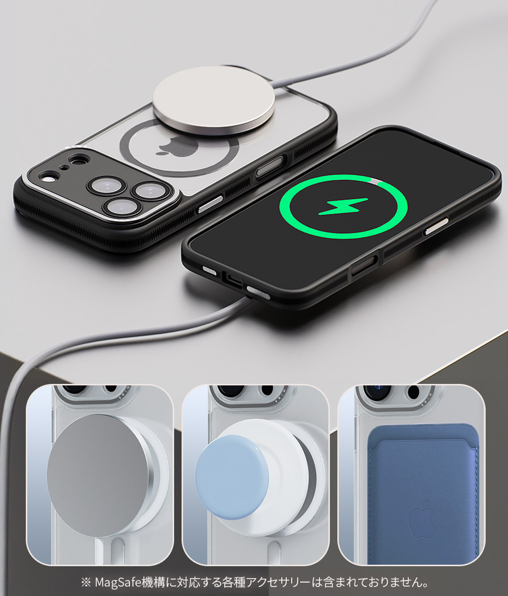 背面にマグネットを搭載しているので、ケースを装着したままMagSafeワイヤレス充電ができます。スタンドやウォレットなどの各種MagSafeアクセサリも使用可能。