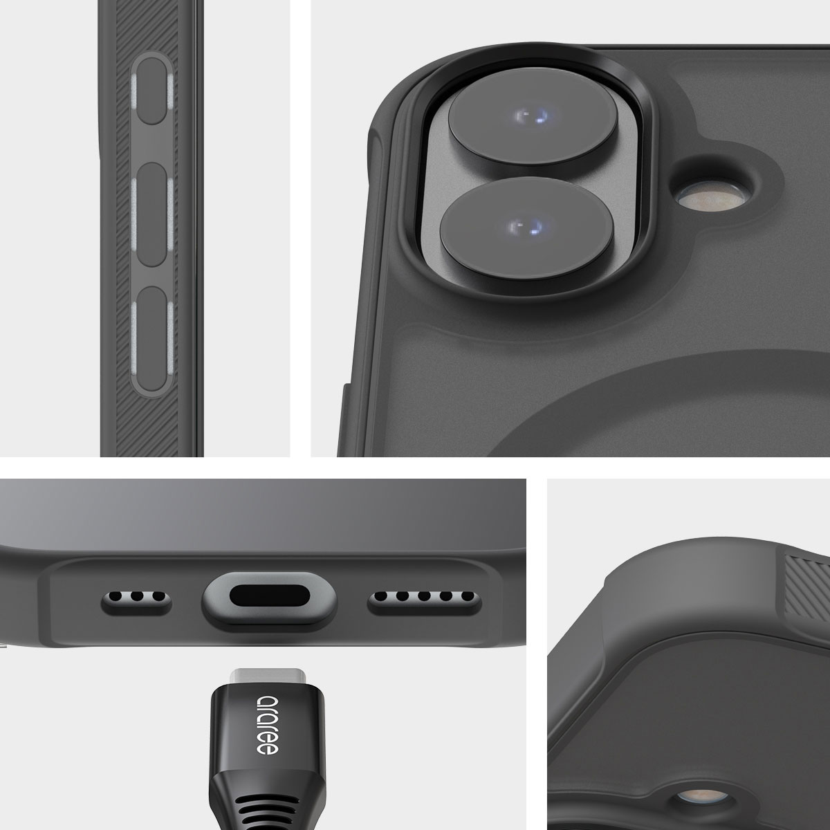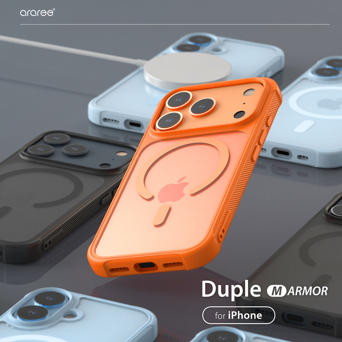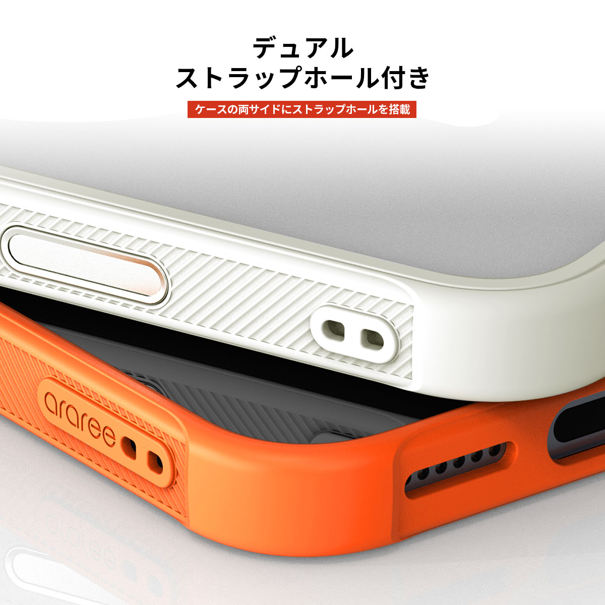 arareeの「DUPLE M ARMOR」は、耐久性の高いポリカーボネートと衝撃吸収性に優れたTPUを使用したハイブリッドケースです。 四隅の衝撃吸収構造で端末を保護し、背面のマグネットリングによりMagSafeアクセサリーにも対応します。