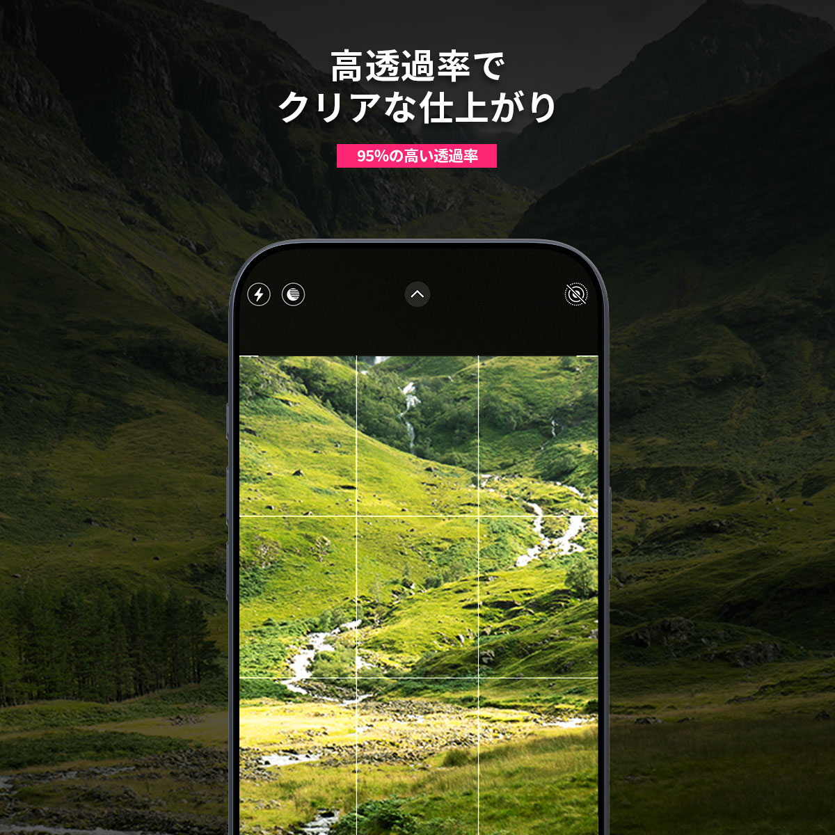95%の高い透過率。より鮮明なカメラ性能を実現するため、反射防止コーティングも施しています。