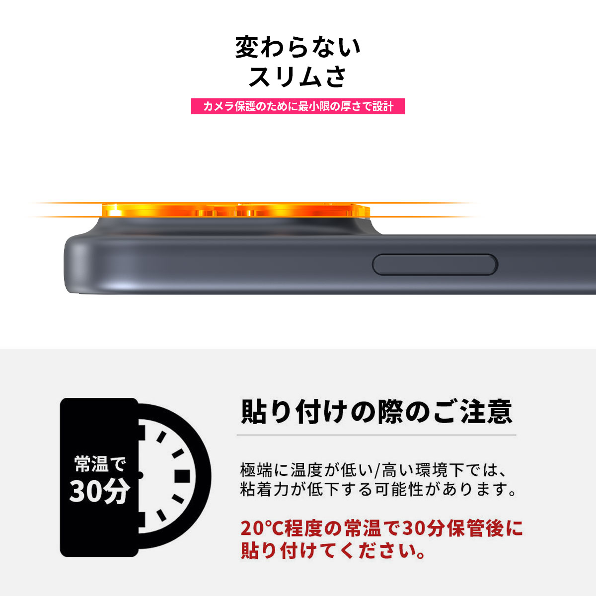 カメラ保護のために最小限の厚さで設計されており、装着後も違和感のない元のスリムさを保ちます。