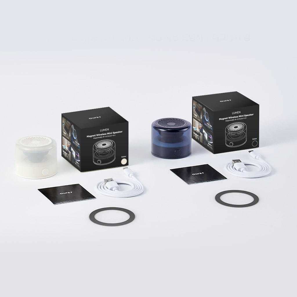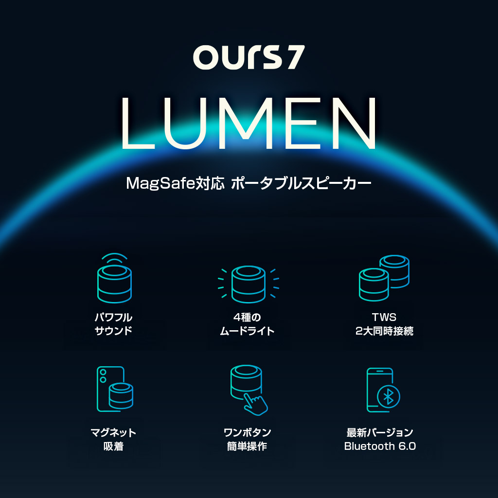 OURS7 LUMENは、コンパクトなボディに強力なマグネットを搭載したポータブルスピーカーです。底面に搭載されたマグネットで、スマートフォンや身近な金属面に簡単取り付け。小型ながらも、最大5Wのパワフルな出力を実現しました。最新のBluetooth 6.0に対応し、クリアで遅延の少ないサウンドを楽しめます。