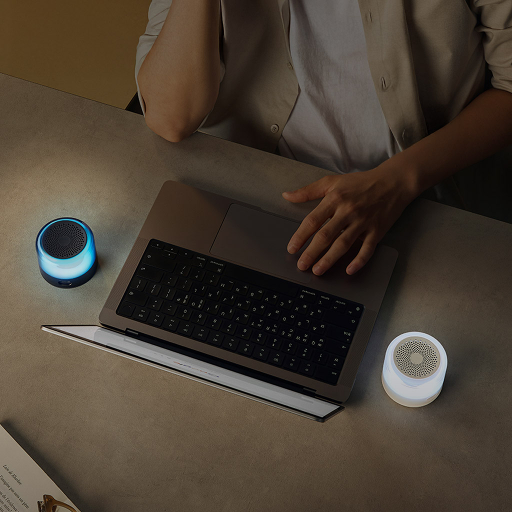 透明なデザインに、ライトエフェクトを融合。音と光が連動し、ゲームやパーティーシーンを華やかに演出します。色温度の異なる2つの白色モード(クールホワイト / ウォームホワイト)に加え、ゆっくりと明滅しながら色が移り変わるブリージングモード、光がスピーカー内を回転しながら色を変えていくスピニングモードを搭載。本体のボタンをダブルタップすることで各モードの切り替えが可能です。