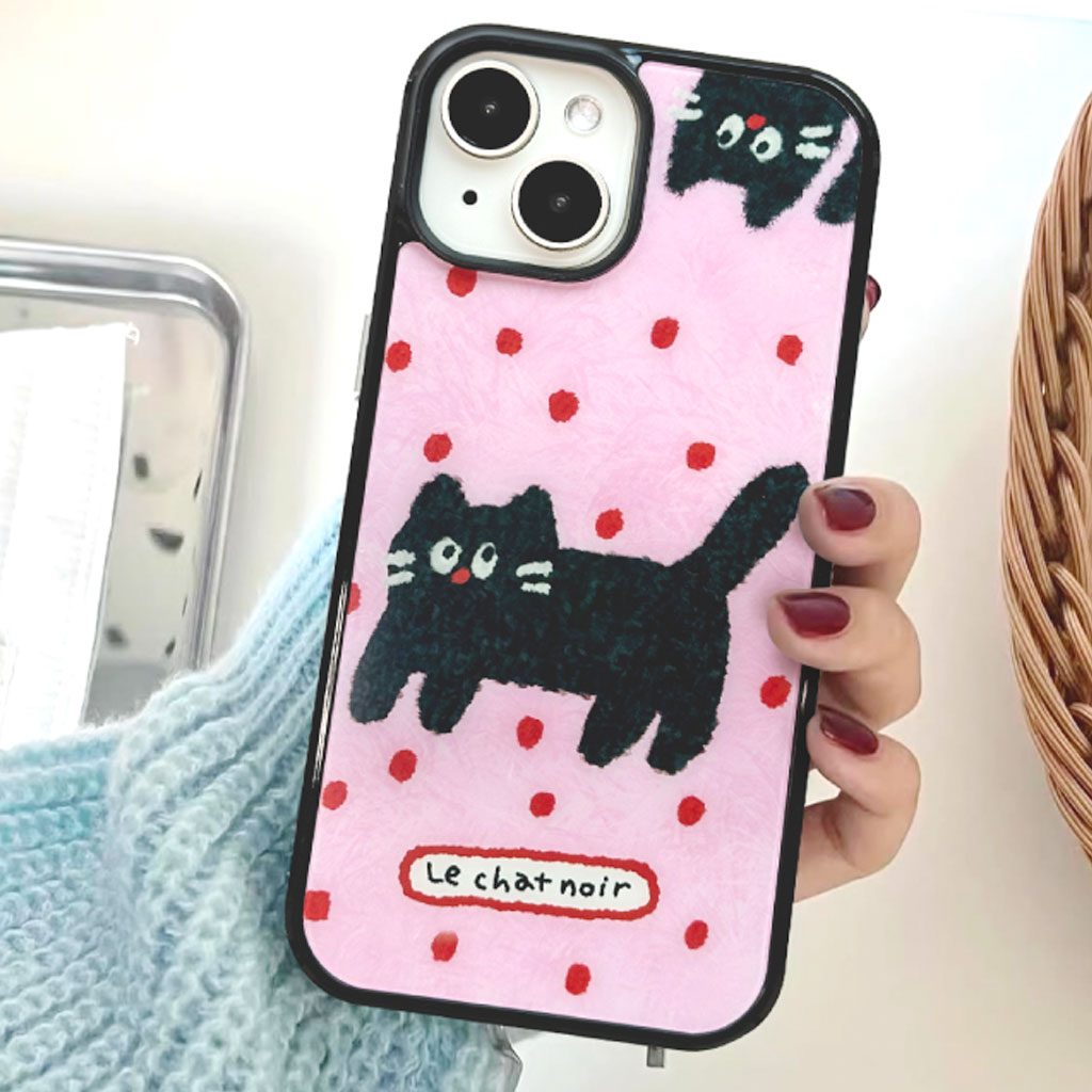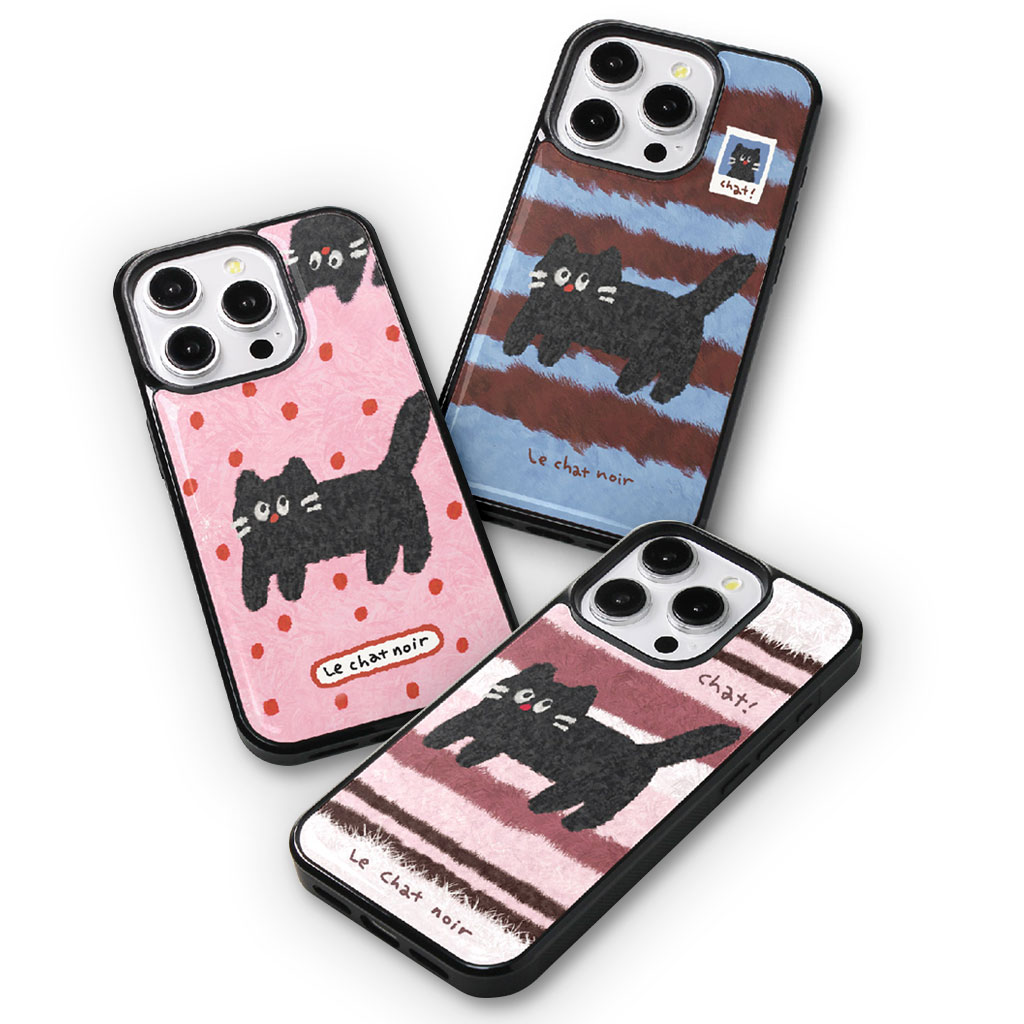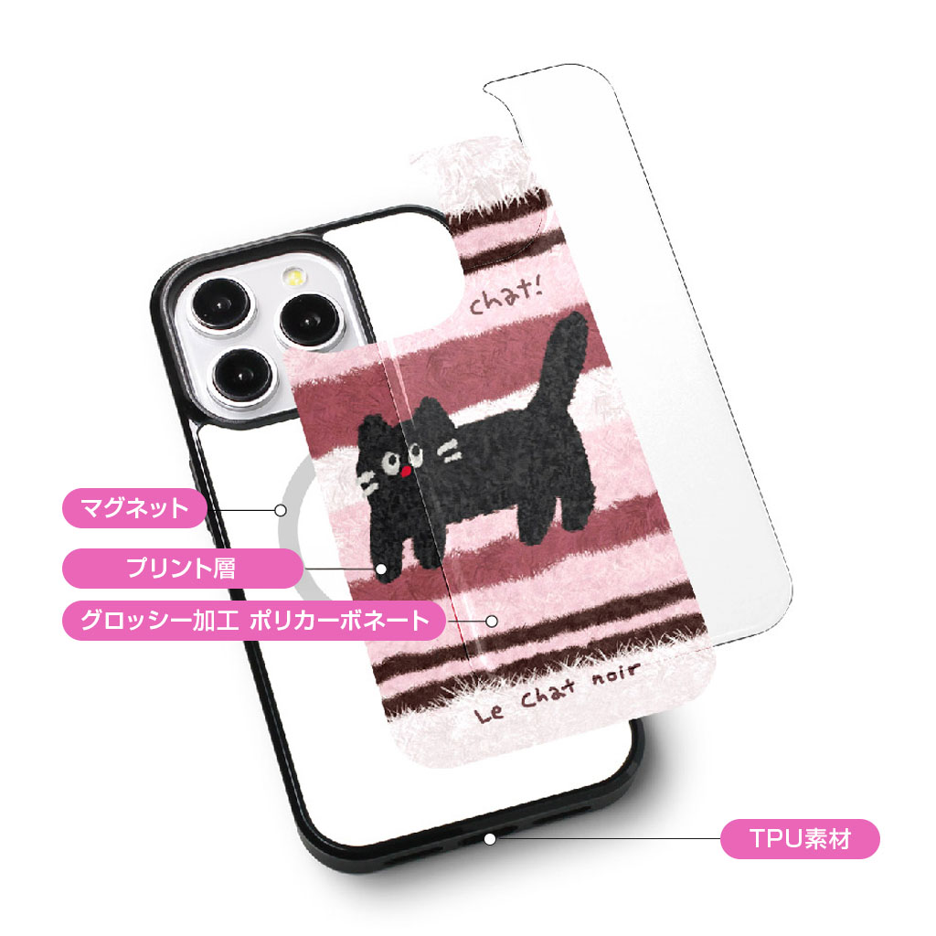 手描き風のやさしい黒ねこのイラストと、ガラスのような艶感が映えるグロッシー仕上げが特徴的なiPhoneケースです。MagSafeに対応し、実用性とデザイン性を兼ね備えています。