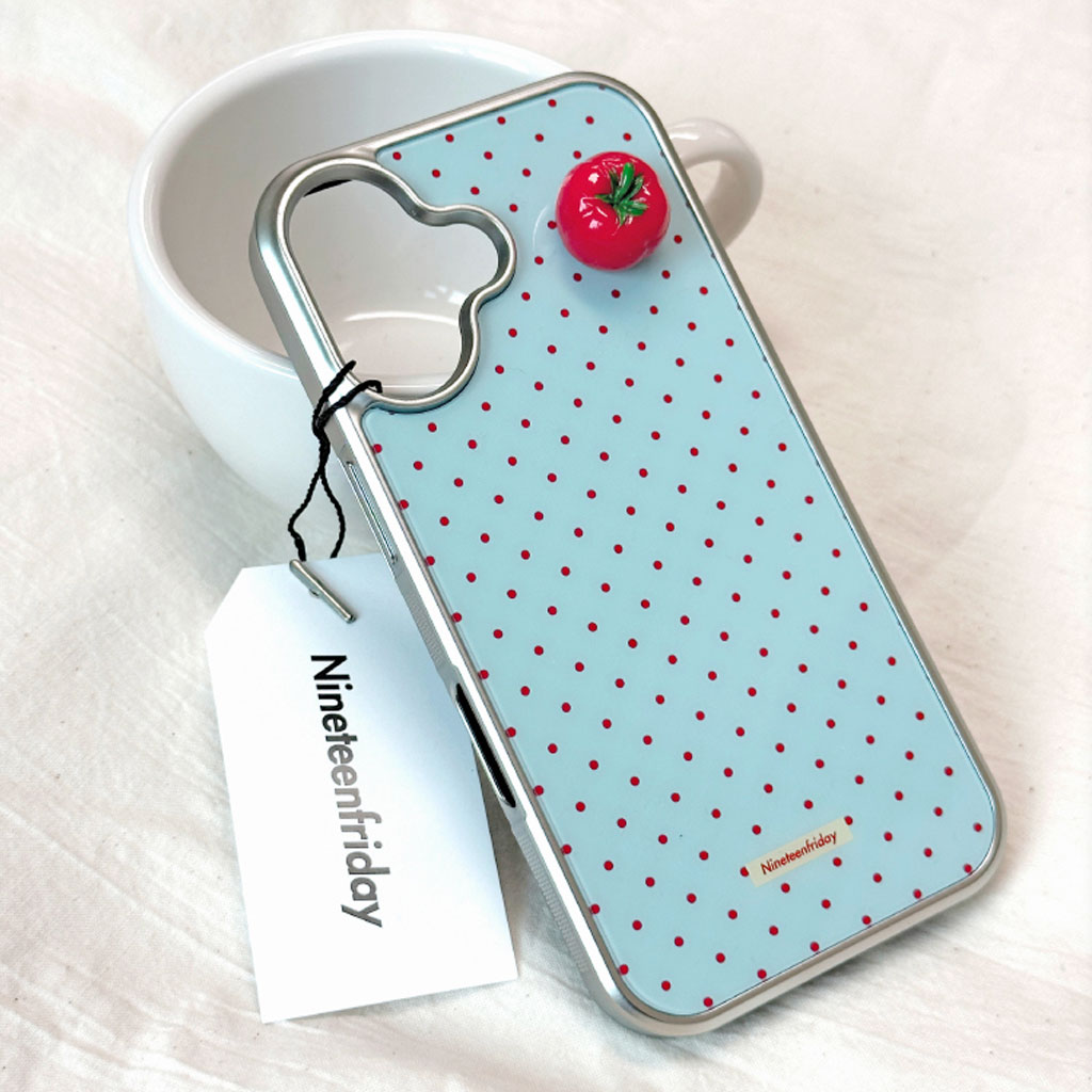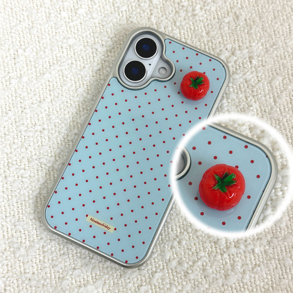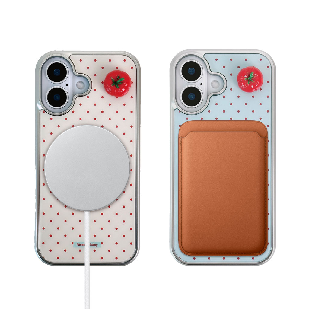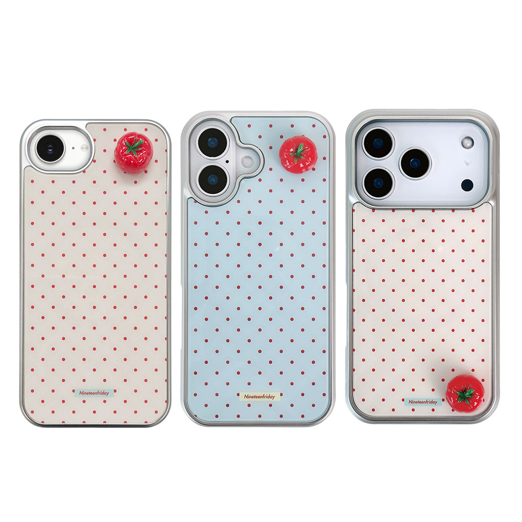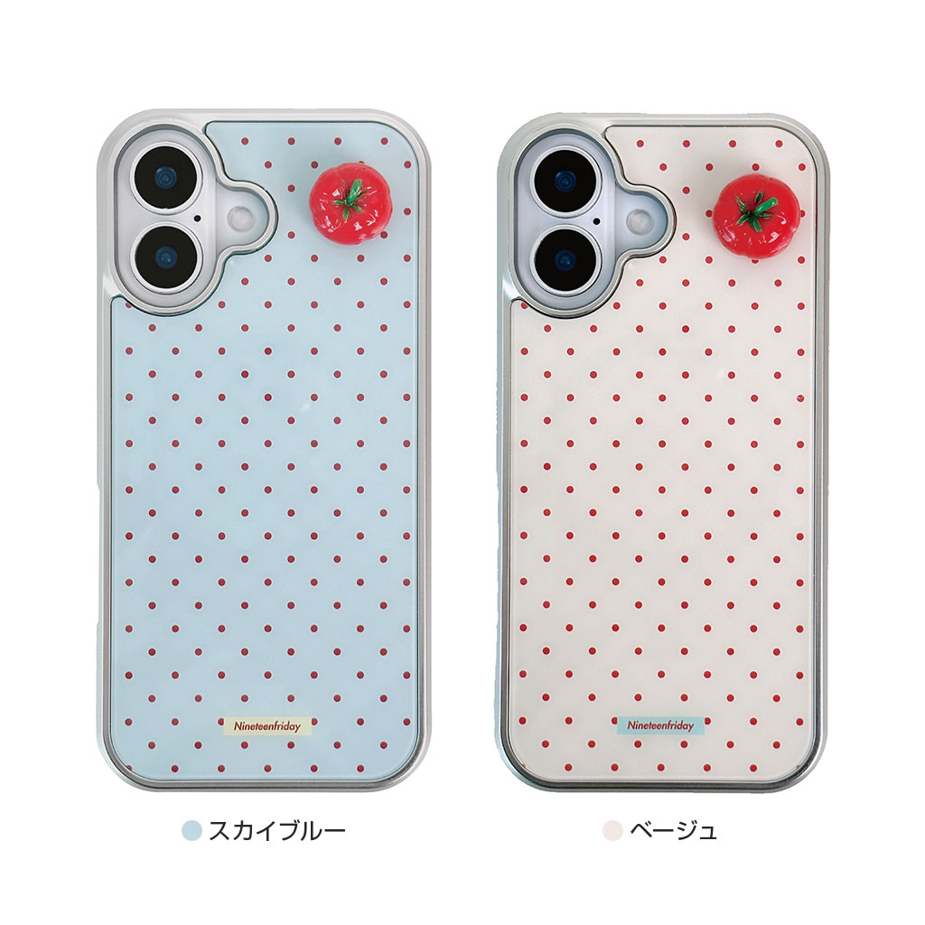 丸みのある立体トマトモチーフがデザインのポイントに。存在感のあるフォルムがシンプルなケースに遊び心をプラスします。ドット柄ベースにも映える、キュートで印象的なワンポイントです。