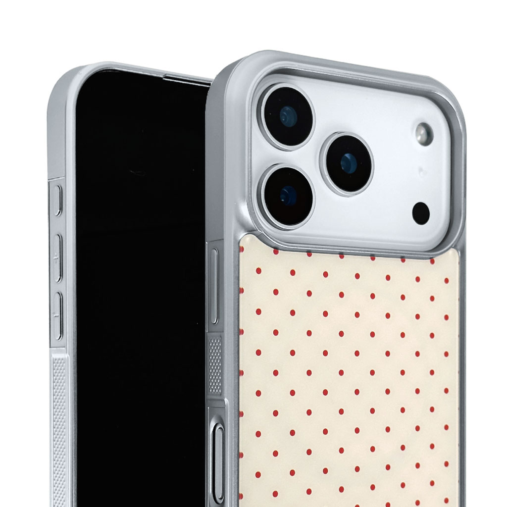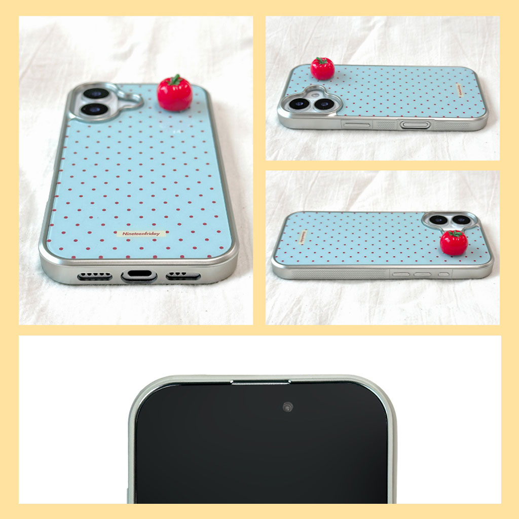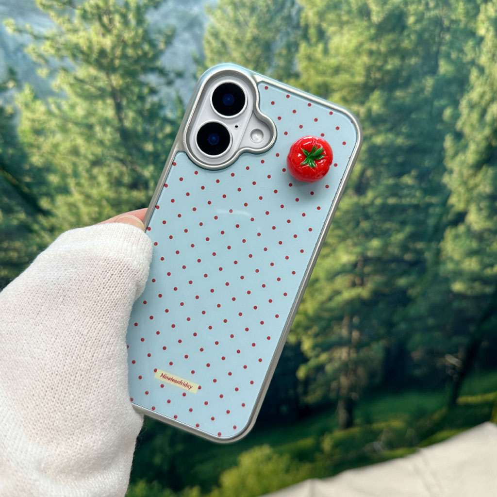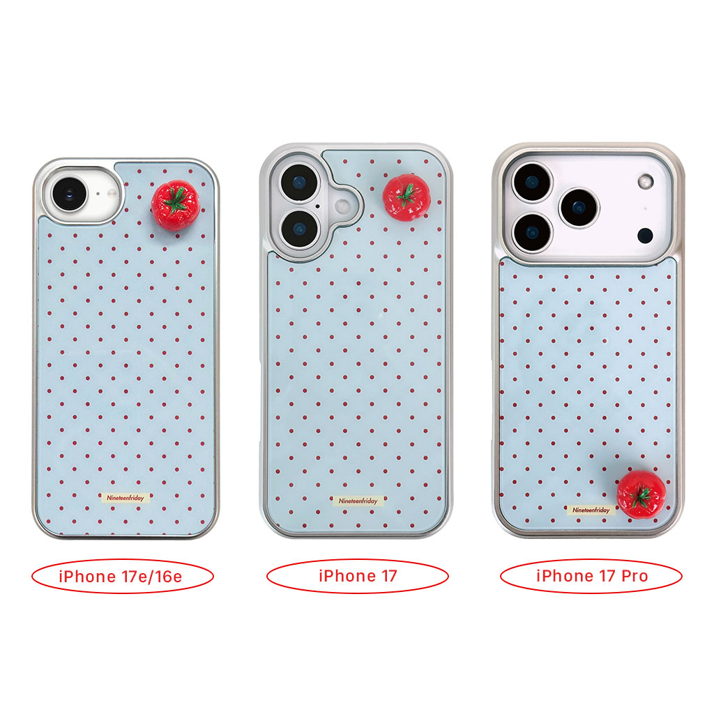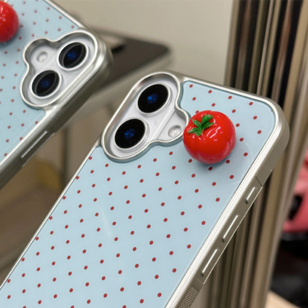 丸みのある立体トマトモチーフがデザインのポイントに。存在感のあるフォルムがシンプルなケースに遊び心をプラスします。ドット柄ベースにも映える、キュートで印象的なワンポイントです。