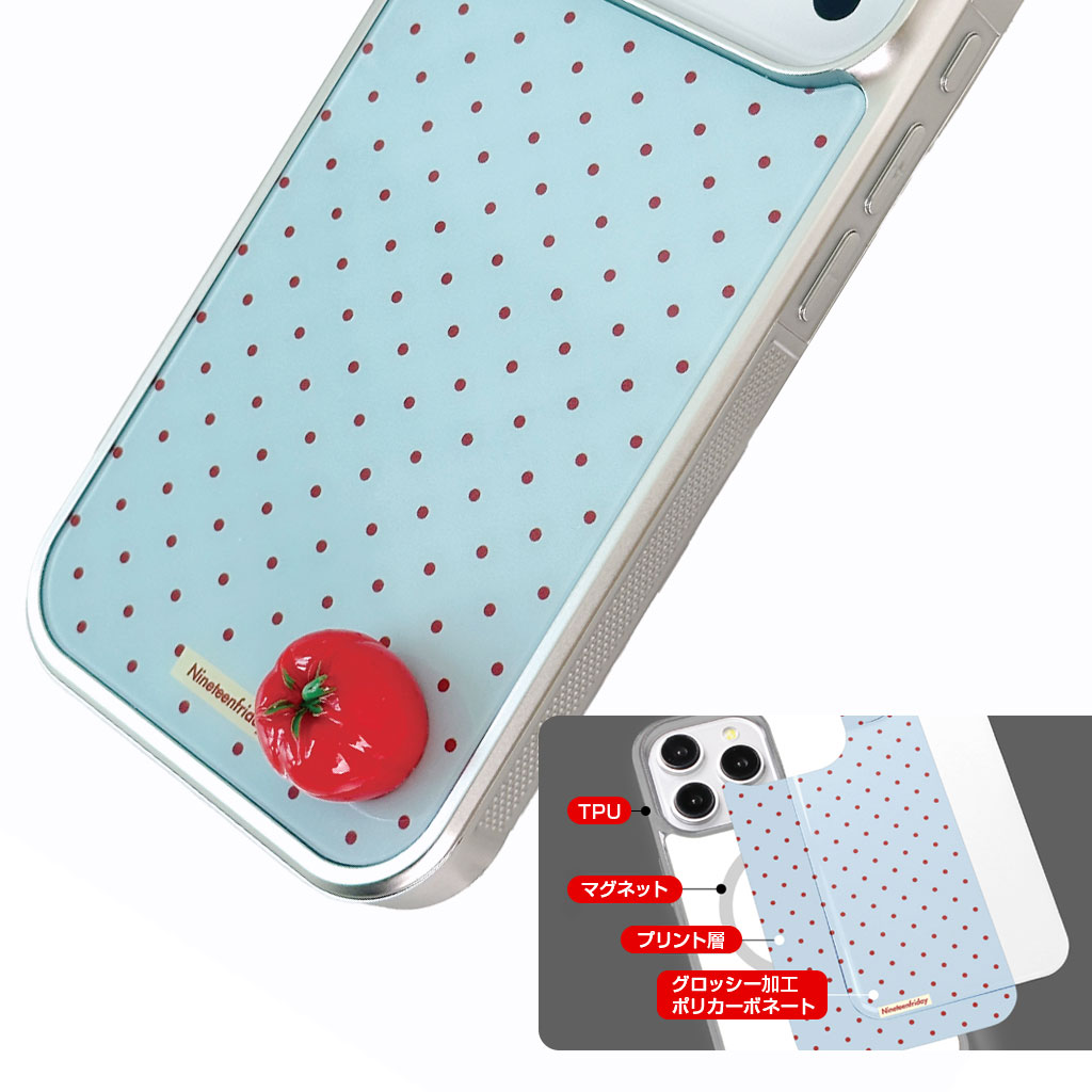立体のトマトをアクセントにした可愛いデザインと、艶やかなグロッシー仕上げが特徴的なiPhoneケースです。MagSafeに対応し、実用性とデザイン性を兼ね備えています。