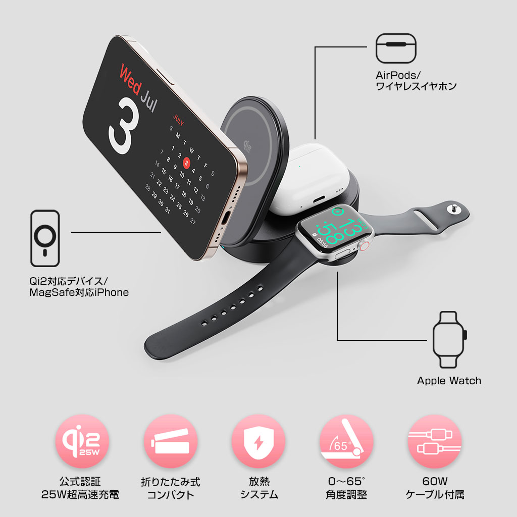 iPhone・AirPods・Apple Watchを同時にワイヤレス充電可能。複数のケーブルを使う必要がなく、デスク周りをすっきりと整理できます。