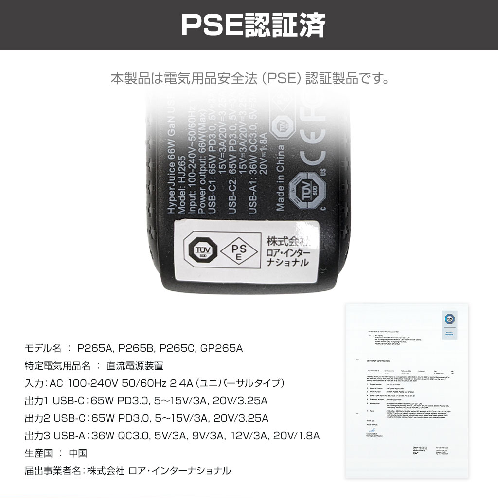 【HyperJuice 66W 充電器】ポリカーボネート、ABS樹脂 ・発売元:株式会社ロア・インターナショナル(support@roa-international.com)